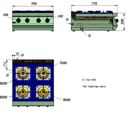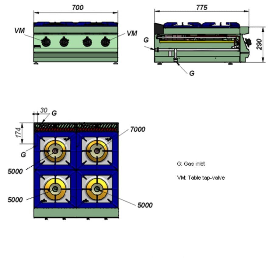 - Burners of different strengths to adapt to containers and for use with different foods: · 5.25 kW (Ø 100 mm), · 8.0 kW(Ø 120 mm),