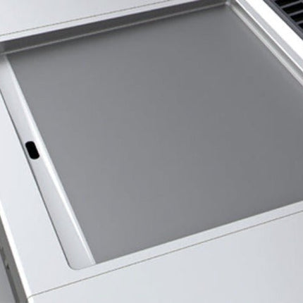 We design our fry-tops so that the plate and countertop joints are made with radii and rounded angles, according to the EN-203-3 standard criteria on materials in contact with food. These radii on edges and corners are never less than 3.5 mm, which facilitates cleaning. The tilting of the plate towards the front facilitates the collection of fats and liquids towards the collection hole, to be poured into the removable fat collection drawer. We offer the option of adding anti-splatter back splashes, which are easily removable and washable since they composed of three detachable parts.