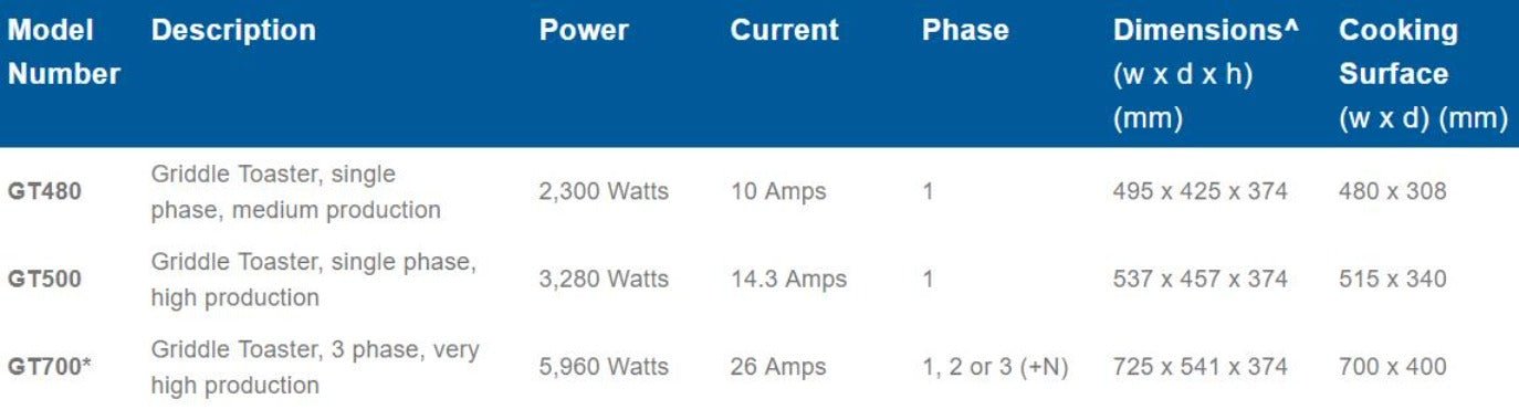 - The larger GT700 model features independent operation of the left or right side of the griddle and toaster for efficient use in quiet periods